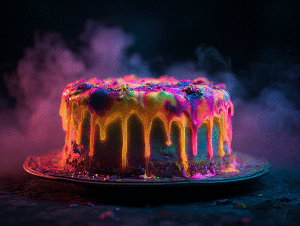 This cake looks gorgeous in daylight, but under UV light it glows like a neon sign. Bakers use special food-safe pigments to make the frosting pop.