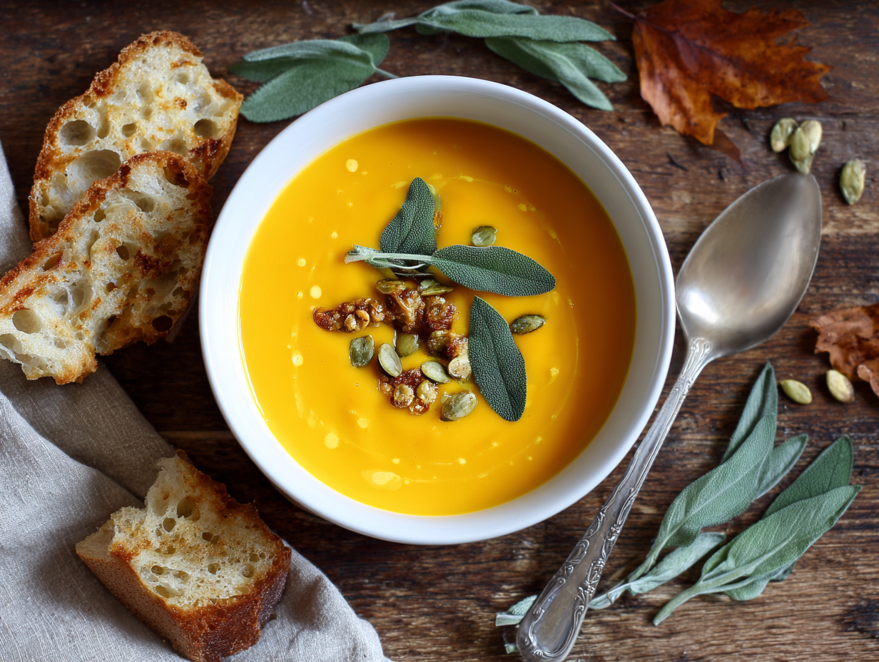Creamy Pumpkin Soup with Sage & Toasted Seeds