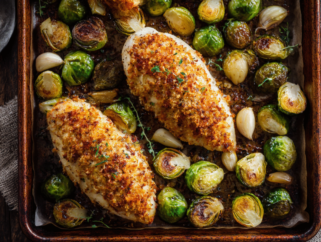 So you’re craving something that tastes fancy but requires the same amount of effort as reheating pizza? This Parmesan Chicken & Brussels Sprouts Sheet-Pan dinner is here to save your evening. It’s crispy, cheesy, full of flavor, and—best part—made on one pan so you won’t be stuck doing an endless pile of dishes. Win-win.